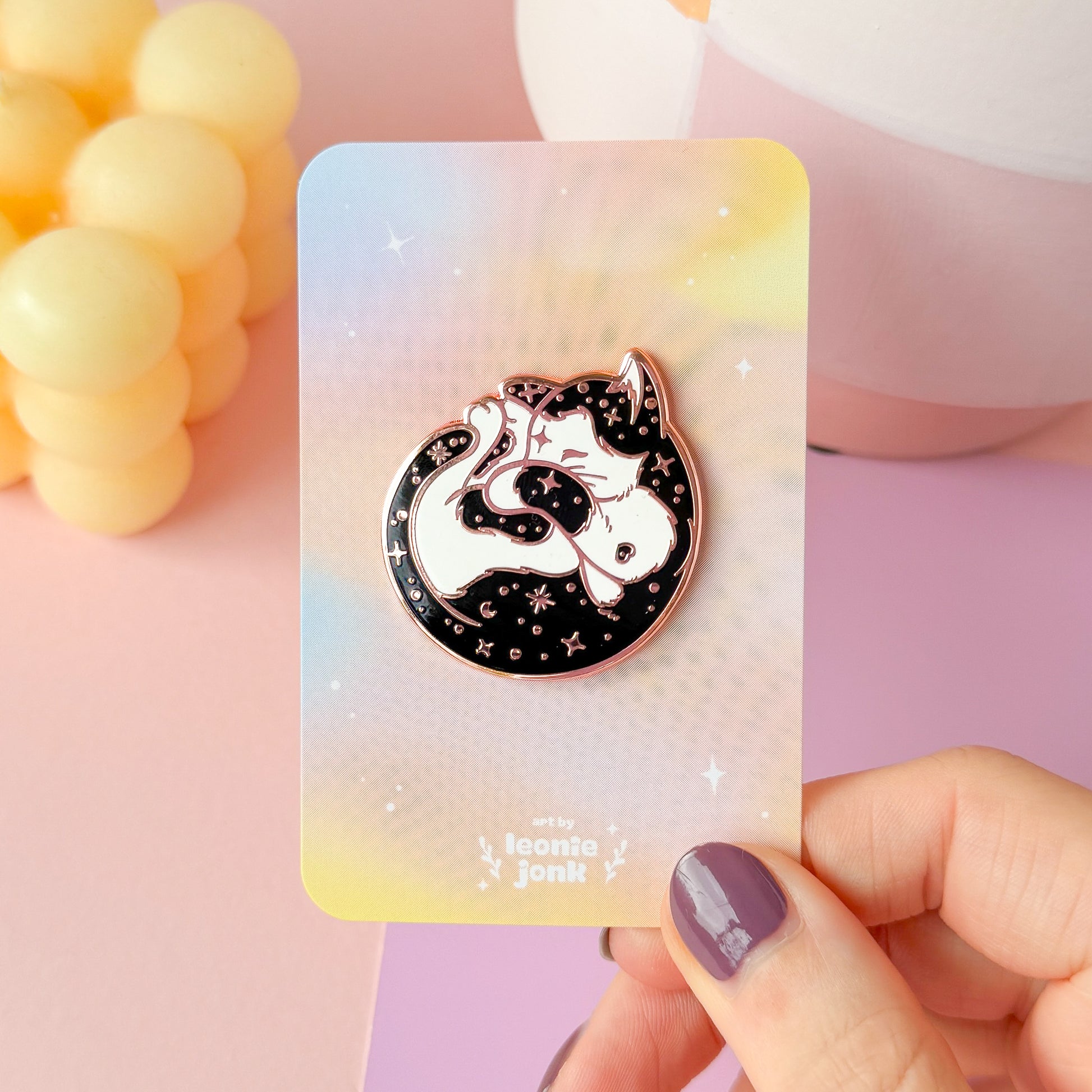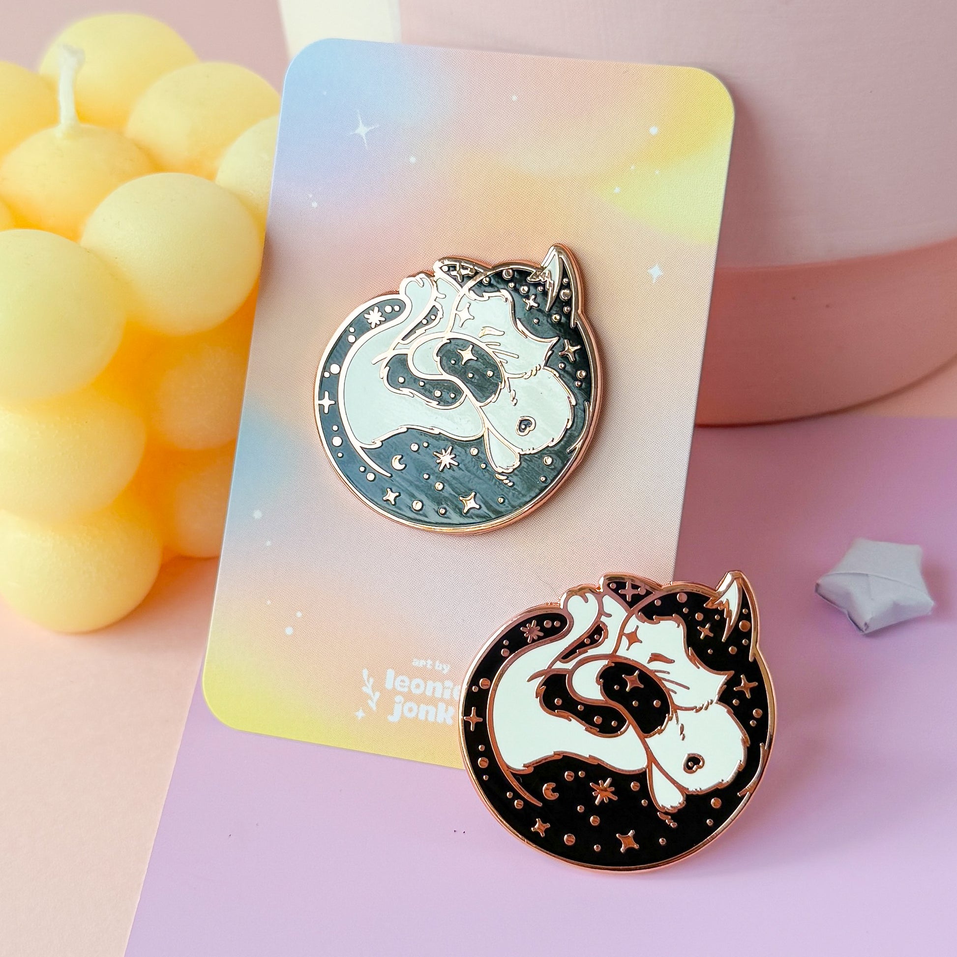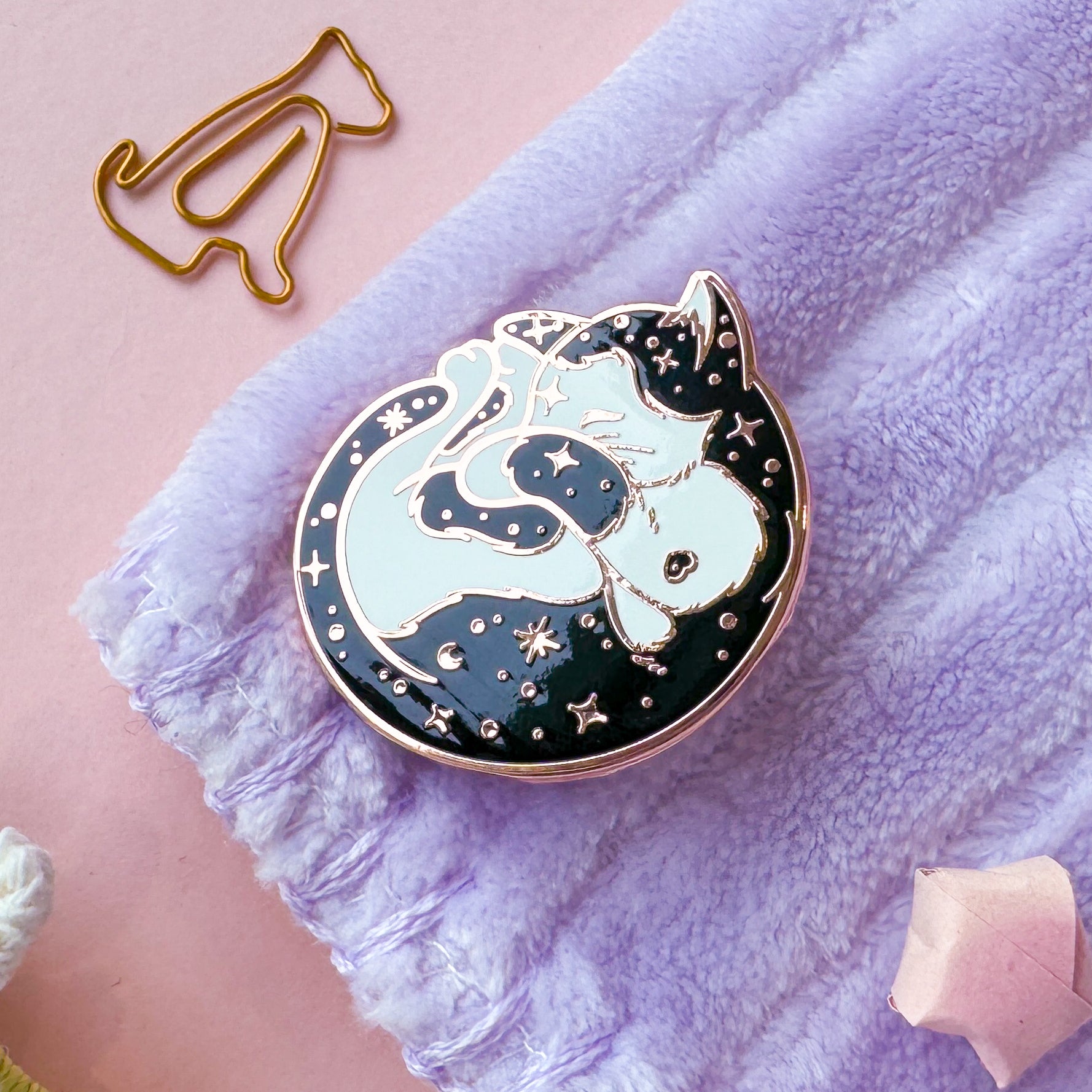 This adorable Galaxy Kitty pin of a curled up snoozing tuxedo cat is showing off the galaxy shining out from her black fur. Galaxy Kitty measures about 1.5" in size and is finished with a beautifully polished rose gold finish. The black and white sections are made from hard enamel and can withstand a scratch. The pin has 2 posts in the back for better security with two black rubber pins.