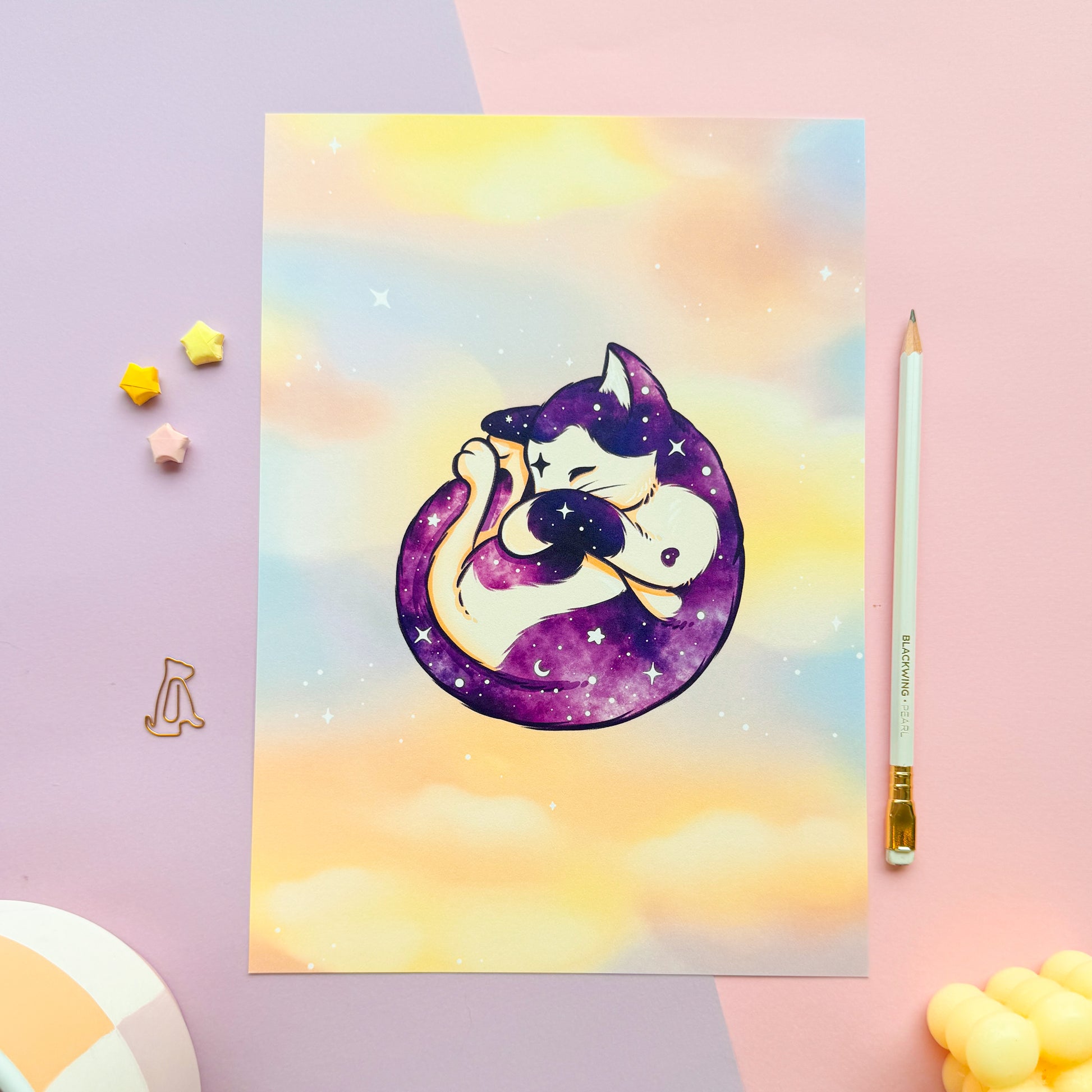 This print works perfectly in any room that can use a cute touch. Thanks to the high-quality paper it works as a wonderful as a gift for a bedroom, office or even nursery or a gift for a lover of cats and space!