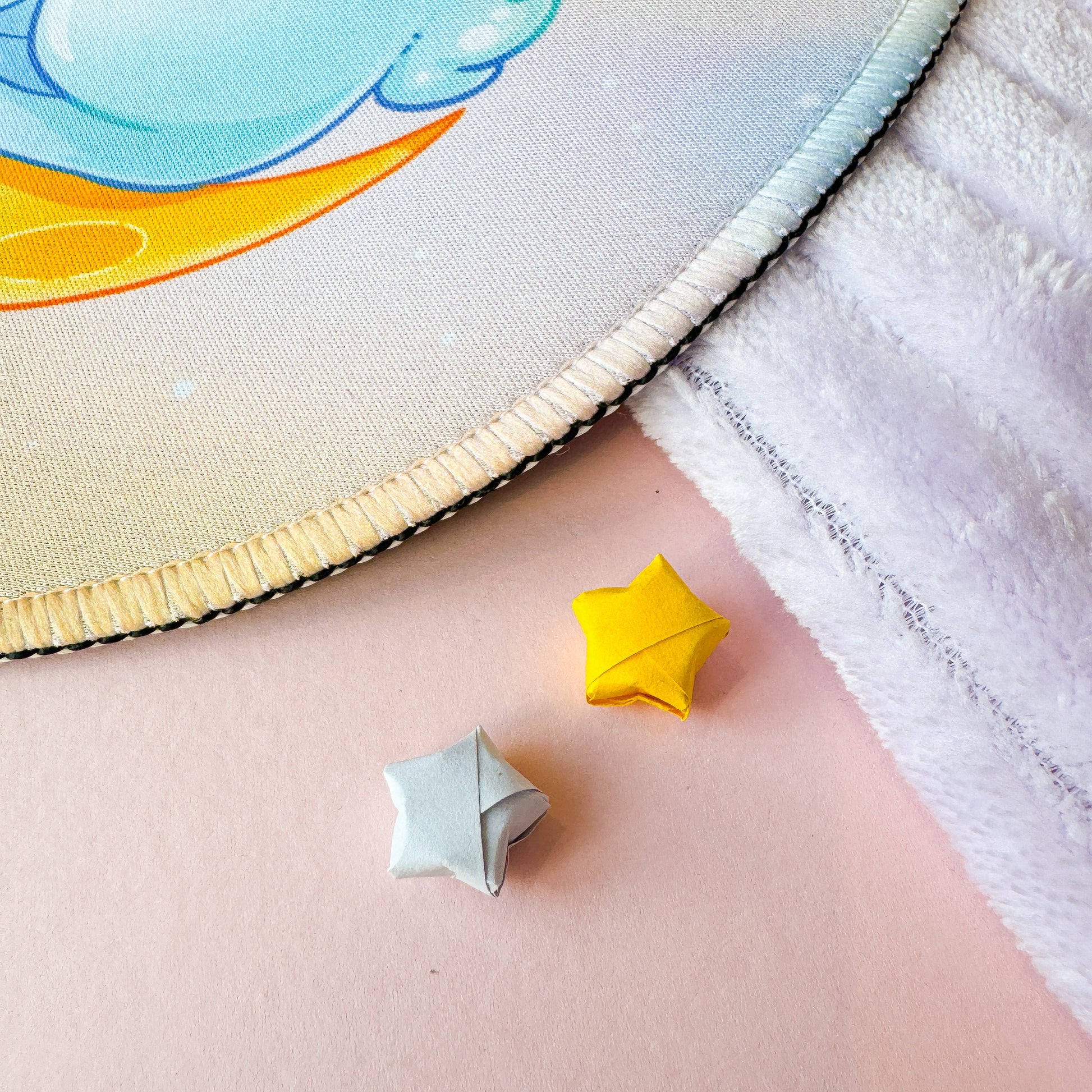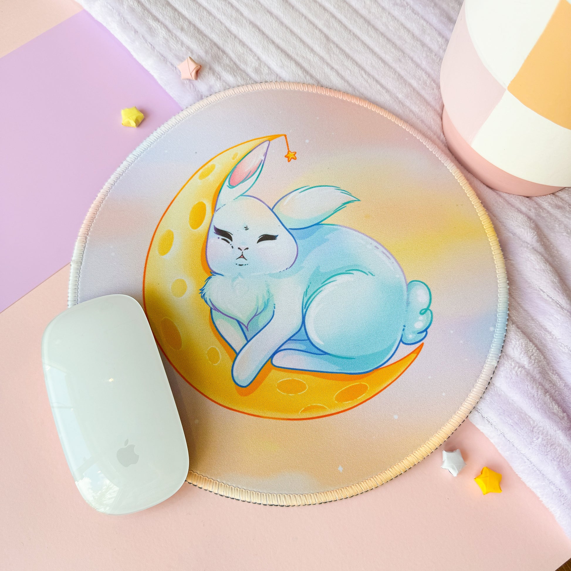 Add a dreamy touch to your workspace with this charming round mousepad, featuring a sweet blue bunny nestled inside a glowing crescent moon. Crafted with care, this mousepad has a luxuriously soft surface that’s gentle on your wrist, complete with coloured stitching along the edges for a polished finish. The anti-slip rubber bottom ensures it stays in place during all your scrolling and clicking.
