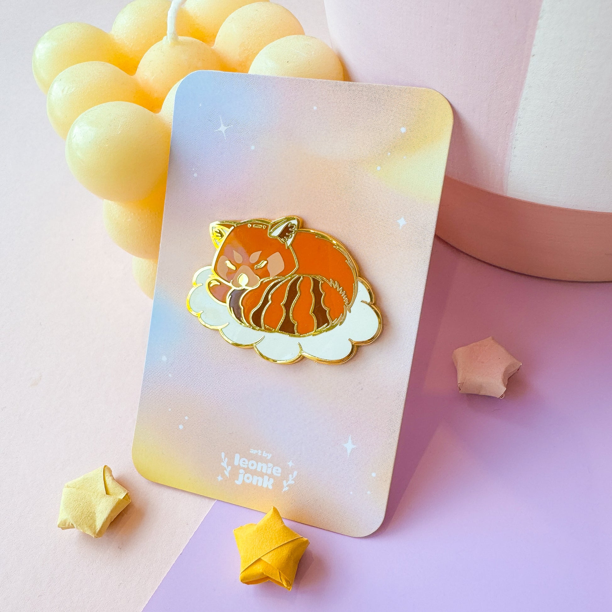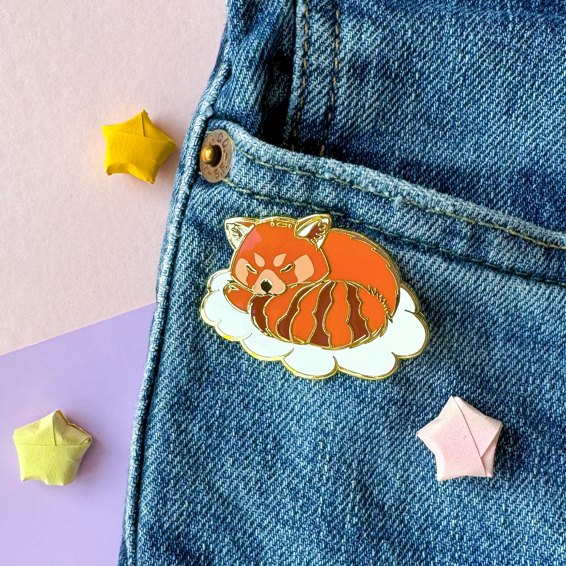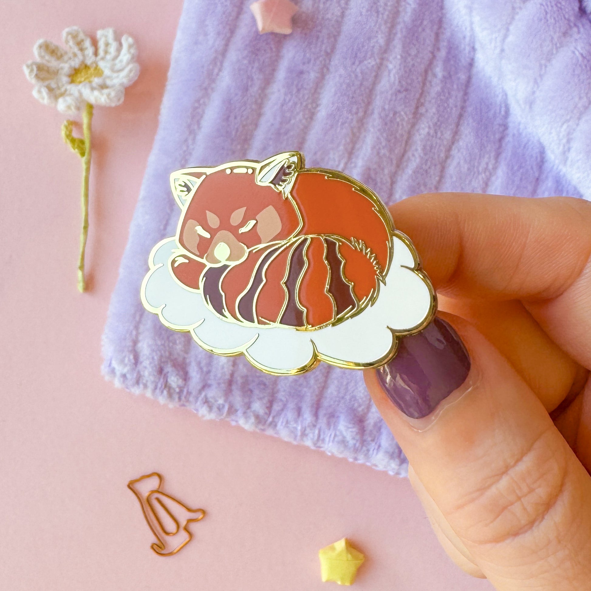 Add a touch of cuteness to your collection with this Red Panda Enamel Pin, featuring an adorable red panda curled up and sleeping peacefully on her soft white cloud! This high-quality, durable enamel pin is crafted with a shimmering golden outline that beautifully frames the design, adding a little extra sparkle wherever you place it.