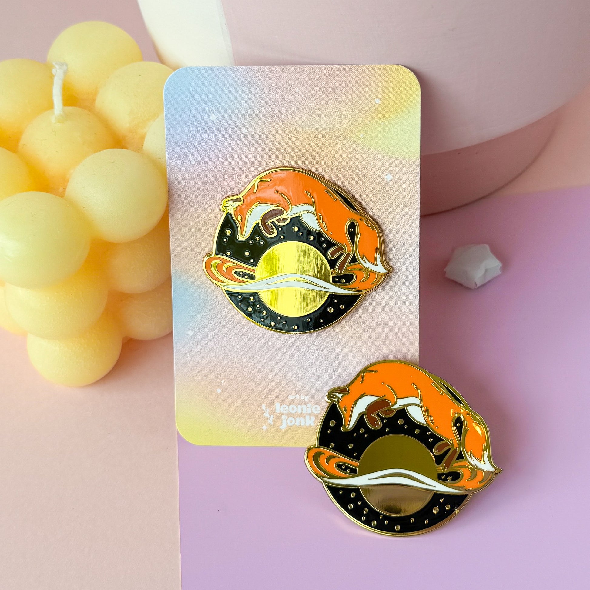 Add a touch of whimsy and wonder to your collection with this stunning enamel pin! Featuring a vibrant red fox gracefully leaping over a shimmering golden Saturn, this pin combines playful nature with celestial charm. Perfect for nature lovers, space enthusiasts, or anyone looking to elevate their style with a unique, eye-catching accessory.
